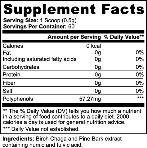 Ingredients: Birch Chaga and Pine Bark extract containing humic and fulvic acid.
