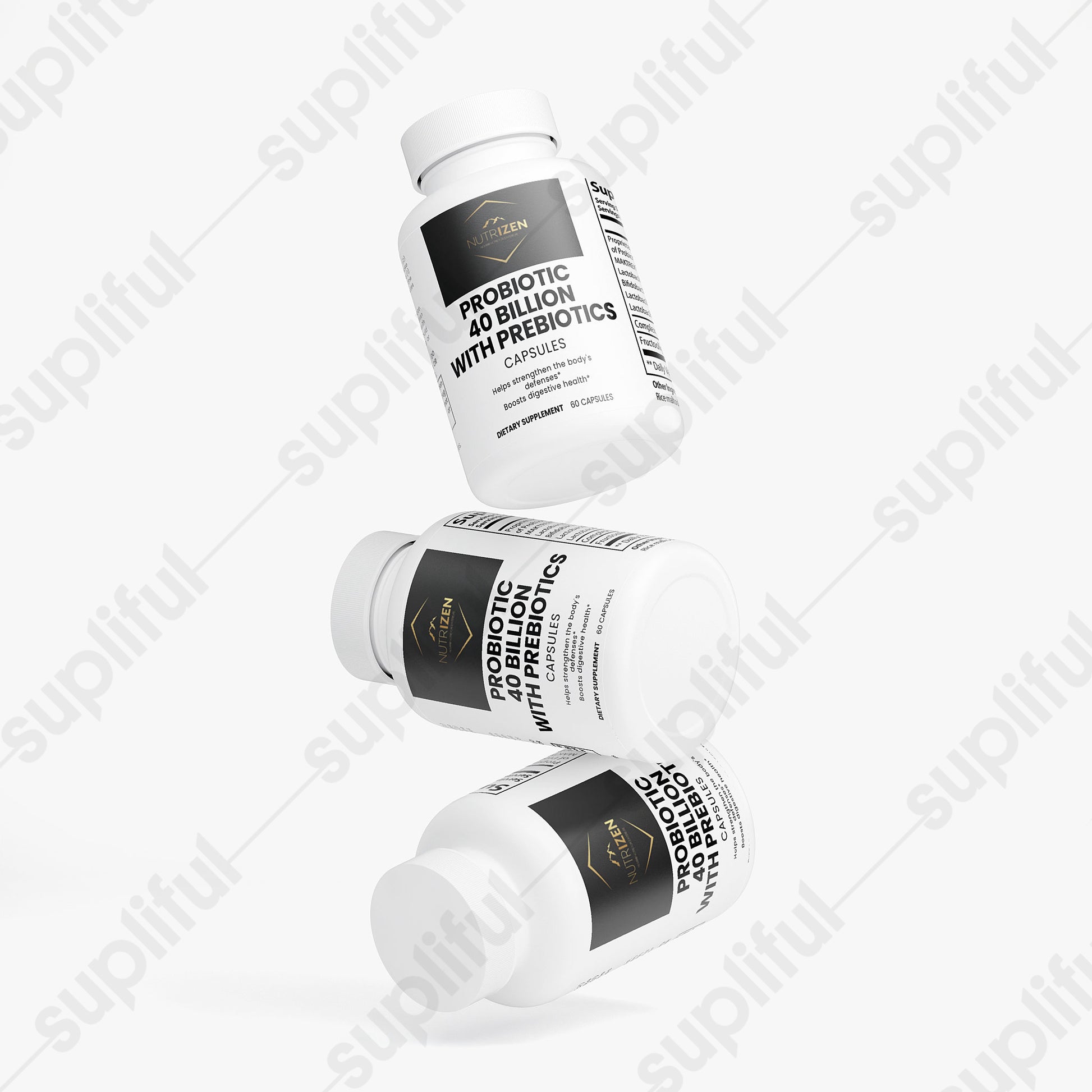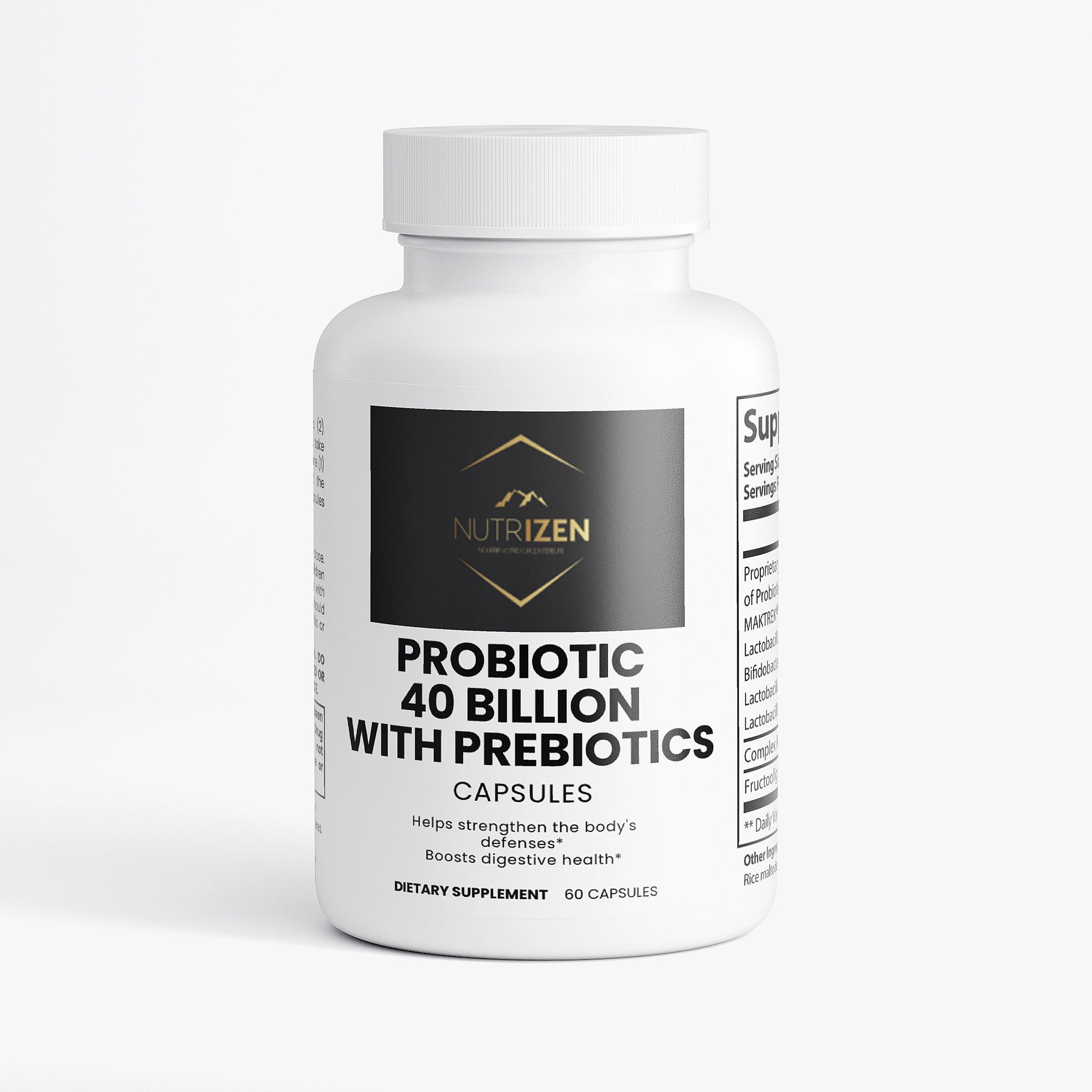 Probiotic 40 Billion with Prebiotics is a blend of four probiotic strains: Lactobacillus Acidophilus, Bifidobacterium Lactis, Lactobacillus Plantarum, and Lactobacillus Paracasei.